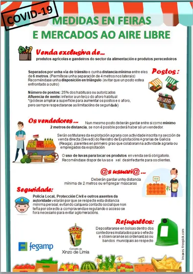 Nesta primeira feira, axentes da Policía Local e voluntarios de Protección Civil ocuparanse de velar polo cumprimento das normas sanitarias, especialmente no relativo á distancia mínima persoal, evitando calquera contacto social que non teña por obxecto a compravenda e regulando o acceso se fora necesario para evitar aglomeracións.