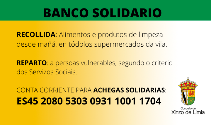 Ademais, o Banco Solidario habilitou unha conta bancaria (ES45 2080 5303 0931 1001 1704) para que a veciñanza, empresas e negocios que o prefiran podan realizar achegas económicas para a compra de alimentos, que neste caso tamén poderían ser frescos, a estas mesmas familias.