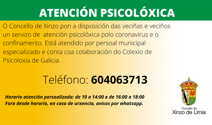 Dende Concello considérase que a axuda psicolóxica é fundamental en momentos de crise como a que estamos a vivir. Neste senso, a alcaldesa de Xinzo de Limia, Elvira Lama, fai un chamado a toda a poboación para que coide tamén a súa saúde mental, que en situacións como esta pode resentirse pola tensión, a ansiedade, a necesidade de compatibilizar o traballo diario ou o tele-traballo co coidado dos fillos durante as 24 horas do día ou simplemente pola sobreinformación que estamos a recibir.
