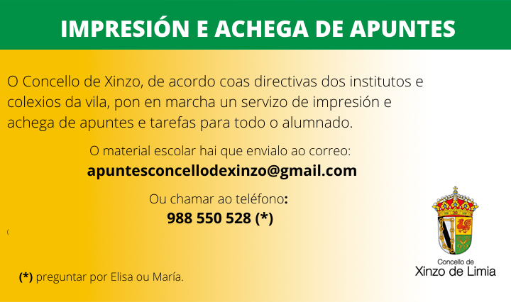 O Concello de Xinzo activará a partir de mañá un servizo de impresión e achega de apuntes e tarefas a alumnos dos catro centros educativos do municipio. Así se acordou hoxe despois de falar coas directivas de institutos e CEIPs.