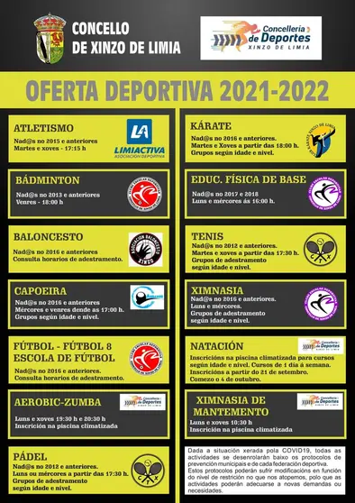 Nin en tempos anteriores á pandemia se recordaba tanto interese por participar nas actividades deportivas e lúdicas que oferta o Concello de Xinzo a través dos diferentes clubs e asociacións. Non é de estrañar a xulgar pola ampla oferta de disciplinas que van máis alá do fútbol e baloncesto e que, para os máis pequenos, abarcan tamén bádminton, atletismo, natación, capoeira, pádel, tenis, karate, educación física de base, ximnasia rítmica, zumba ou capoeira. A dez días de que remate o prazo para presentar as solicitudes para todas estas actividades saudables, xa hai preto de medio millar de nenos e nenas anotadas, ademais das case 200 inscricións da piscina climatizada.