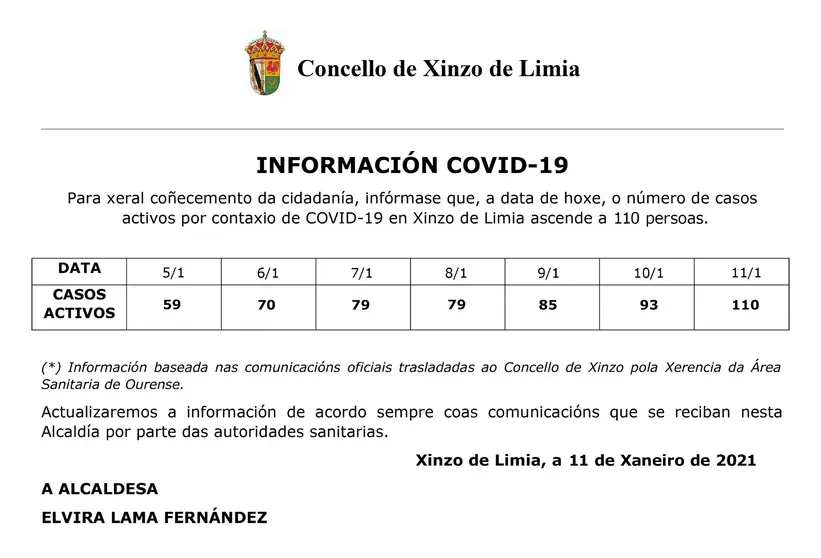 A alcaldesa de Xinzo, Elvira Lama, pídelle ao Sergas un novo cribado masivo en Xinzo de Limia, despois do brusco incremento de casos activos, que no que vai de ano pasaron de 39 o día 1 de decembro de 2020 a 110 hoxe. So dende o pasado día 4, explica Lama Fernández, o incremento foi de 57 casos, que atribúe esta incidencia á mobilidade nas datas de Nadal, nas que se permitiron os reagrupamentos familiares, e ás reunións de non conviventes.