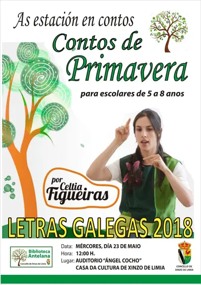 Mañá día 23 de maio ás 12:00 h terá lugar a representación “As estacións en contos; contos de primavera” por Celtia Figueiras para escolares de cinco a oito anos dos colexios de Xinzo de Limia. A obra realizarase no auditorio da Casa de Cultura grazas á colaboración da Biblioteca Antelana e ao Concello de Xinzo de Limia.