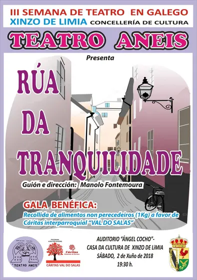 Esta representación tamén contará cunha gala benéfica de recollida de alimentos non perecedoiros a favor de Cáritas interparroquial “ Val do salas”. Coa axuda na organización e colaboración do Concello de Xinzo, de cáritas “ Val do salas” e do teatro Aneis cierra como anfitrión o III Festival de teatro en galego.