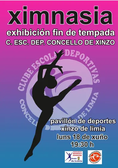 O luns 18 xuño as 19:30 h ,terá lugar, no pavillón de deportes de xinzo de Limia, a exhibición de fin de tempada de ximnasia rírmtica do Clube de Escolas Deportivas de Limia. Patrocina a Concellería de Xinzo de Limia e o clube de escolas deportivas.