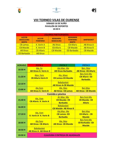 O día 16 de xuño, a partir das 10:30 h da mañá, terá lugar o VIII Torneo de Vilas de básquet de Ourense. Tal e como indica o nome, a característica principal deste torneo é que soamente xogan equipos das diferentes vilas de Ourense. Patrocinan a Concellería de Deportes e Xuventude de Xinzo de Limia, a Deputación de Ourense e o A. B. Xinzo.