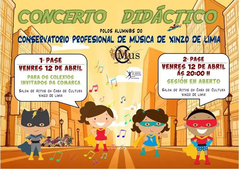 O concerto didáctico que se vai ofrecer nesta ocasión é unha representación teatral-musical no que os Superheroes serán os protagonistas. Serán os encargados de solventar xunto cos nosos alumnos unha crise musical a nivel mundial que está a eliminar os sons do noso planeta. Como parte da historia soarán obras de diversos estilos musicais que abranguen dende o estilo clásico ata o moderno. Utilizando os diversos instrumentos que impartimos no noso centro o alumnado do conservatorio interpretará obras de Brahms, Verdi, Holst, Joplin, Radiohead, Guns & Roses, bandas sonoras de series e películas, música popular… E no remate do concertó, a orquestra do conservatorio será a encargada de por o broche final coas bandas sonoras de “Os Incríbles” , “Batman”, “X-Men” e “Os Vengadores”.