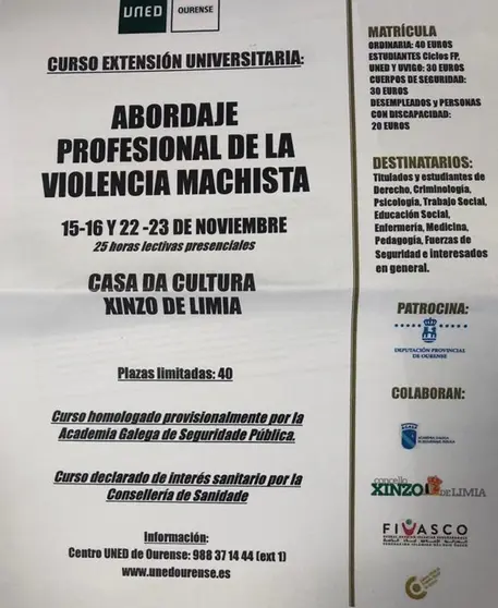 Do 15 ao 23 de novembro impartirase na Casa da Cultura de Xinzo de Limia un curso presencial de extensión profesional sobre o “Abordaje profesional de la violencia machista”, patrocinado pola Deputación Provincial de Ourense e coa colaboración da Academia Galega de Seguridade Pública, o Concello de Xinzo de Limia, FIVASCO e o Colexio Oficial de Traballo Social de Galicia.