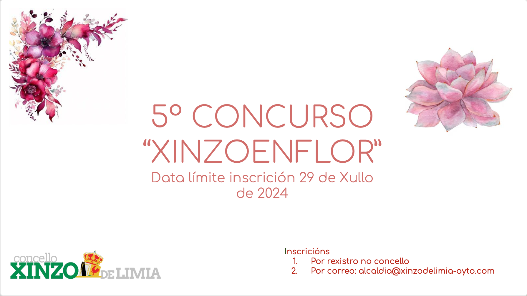 BASES + FICHA DE INSCRICIÓN: https://www.xinzodelimia.gal/media/xinzodelimia/files/2024/07/11/BASES%20Concurso%20XINZOENFLOR%202024.docx%20(1).pdf