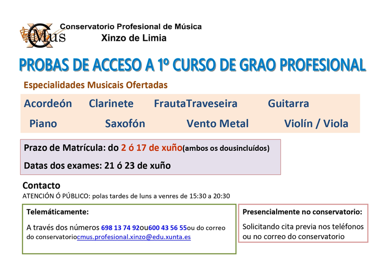 O Conservatorio de Música de Xinzo de Limia abre o prazo de matrícula para as probas de acceso ao primeiro curso de Grao Profesional. Os exames celebraranse do 21 ao 23 de xuño. As especialidades musicais ofertadas son acordeón, clarinete, flauta traveseira, guitarra, piano, saxofón, vento metal e violín.