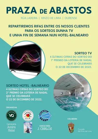 A Praza de Abastos de Xinzo de Limia quere premiar a fidelidade dos seus clientes e animar as vendas nestas datas. Por iso, vén de activar a súa primeira gran campaña de Nadal, da que poden beneficiarse todos aqueles que fagan a súas compras nos seus establecementos. A iniciativa, coa que colabora o Concello, xa comezou e consiste no reparto de rifas entre os compradores para o sorteo dun televisor e unha fin de semana nun hotel-balneario.