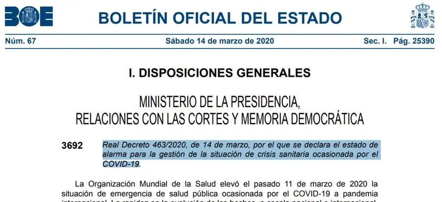 RD 463/2020, do 14 de marzo, polo que se declara o Estado de #Alarma Aquí podedes consultar o RD 463/2020, do 14 de marzo, polo que se declara o Estado de #Alarma para a xestión da situación de crise sanitaria ocasionada polo #COVID19, aprobado onte no #CMin e publicado no BOE.Decreto completo