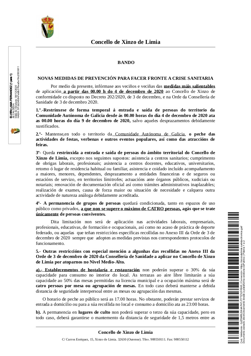 Consulta neste Banda da Alcaldía as restricións que rexen en Xinzo durante a ponte e ata o próximo día 9, ademáis das que teñen carácter xeral. Preme aquí ou na imaxe do interior.