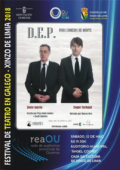 O sábado día 12 de maio ás 19:30 h terá lugar a representación da obra teatral “D.E.P., unha comedia de morte”. O lugar onde se poderá visualizar esta obra será o auditorio “Angel Cotxo” da Casa de Cultura de Xinzo de Limia.