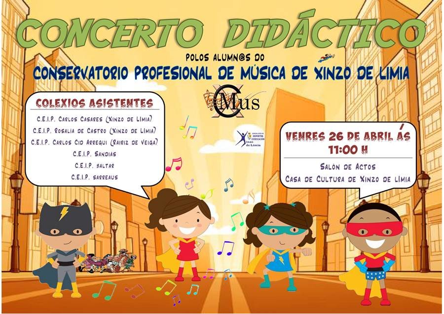 O concerto didáctico que se vai ofrecer nesta ocasión é unha representación teatral-musical no que os Superheroes serán os protagonistas. Serán os encargados de solventar xunto cos nosos alumnos unha crise musical a nivel mundial que está a eliminar os sons do noso planeta. Como parte da historia soarán obras de diversos estilos musicais que abranguen dende o estilo clásico ata o moderno. Utilizando os diversos instrumentos que impartimos no noso centro o alumnado do conservatorio interpretará obras de Brahms, Verdi, Holst, Joplin, Radiohead, Guns & Roses, bandas sonoras de series e películas, música popular… E no remate do concertó, a orquestra do conservatorio será a encargada de por o broche final coas bandas sonoras de “Os Incríbles” , “Batman”, “X-Men” e “Os Vengadores”.