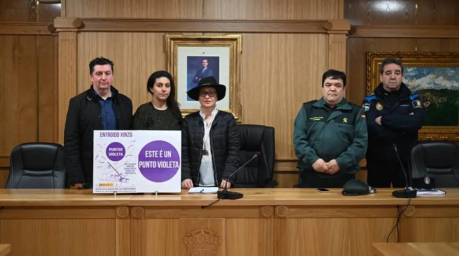 Elvira Lama, acompañada de Adriana Jiménez, membro da comisión do Entroido deste ano e de anos anteriores; o Concelleiro de Cultura; o Tenente da Garda Civil de Xinzo e o Inspector Xefe da Policía Local presentou esta mañá os puntos violeta e as unidades de sensibilización e prevención que se van por en marcha neste Entroido.