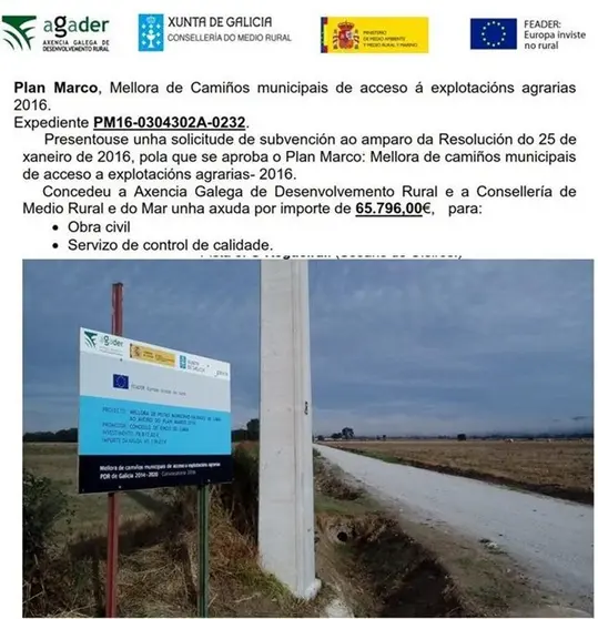 As pistas de A Encibiñeira, e A Curuxeira na Manga. O Pulón en Parada de Ribeira. As Triguizeiras de Damil. Lameira dos Pozos en Moreiras, As Cuadrillas en Pidre; Os Marqueses en Morgade e O Requeiral en Seoane levaranse os 65.796, 00 € de inversión.