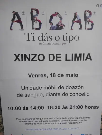 O venres 18 de maio fará unha parada, en Xinzo de Limia, a unidade móbil de dozión de sangue diante do Concello. O horario para as doazóns de sangue serán de 10:00 a 14:00 e de 16:30 a 21:00.