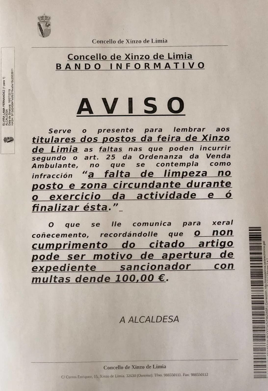 “Por esta razón dende o Concello, comunicamos a través de un Bando municipal os deberes que teñen que cumprir  os donos e donas dos postas de venda ambulante que se queiran instalar nas feiras de Xinzo, así como as sanción que podan percibir en caso de incumprimento” di a alcaldesa Elvira Lama